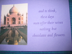Carol Cunningham’s letter press card on lavender paper stock with purple ink is pretty damn cute,…Taj Mahal in all its splendor, and a wry comparison to the modern day “minimum valentine requirement” (“MVR”, SeeKay’s slackronym).