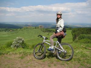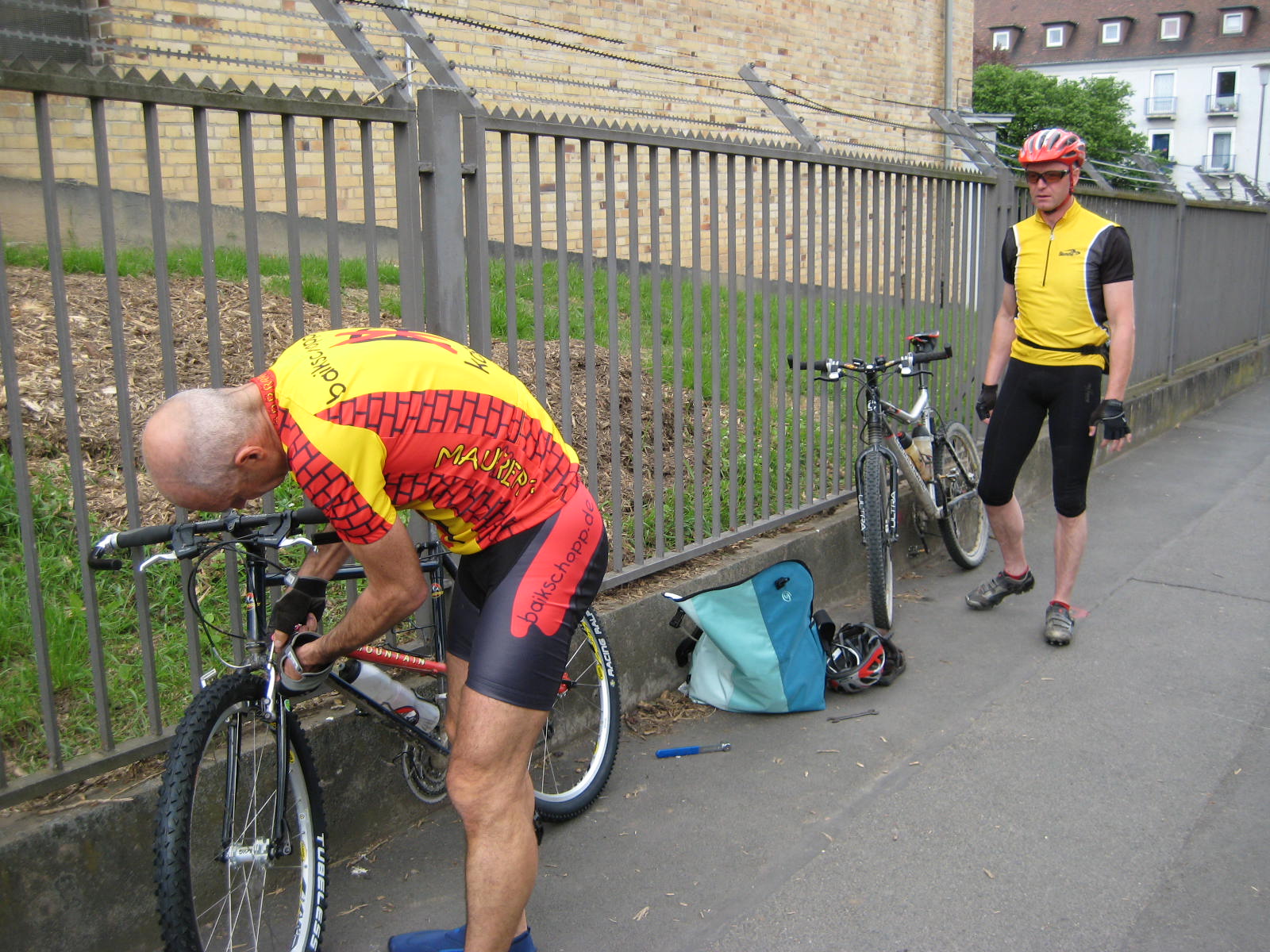 It is an overcast but mellow day. And verily, every ambulatory Teutonic family is out enjoying a non shopping day. The hills are green and the birds are singing their heads off. At our first stop, Geo notices that his cassette is wobbly. A part is missing.