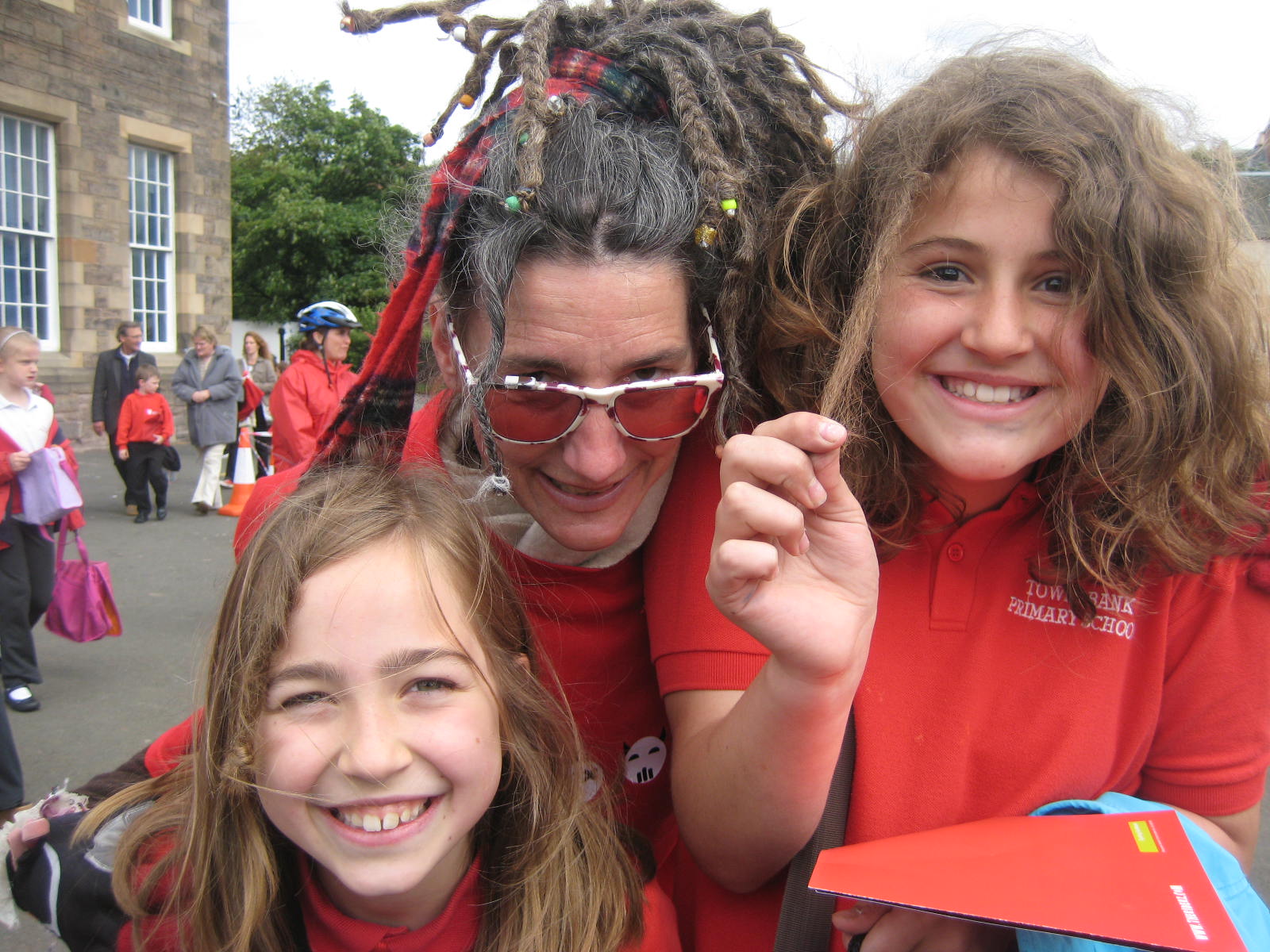 Also good (but should have been the morning activity, and then be followed by the show): skill-building exercises (riding along an elevated “timber trail” as well as my patented track-stand lesson, and the “nervous novice” (I call it chicken shit) ‘look where you want to go’ game, which involves riding along a board on the ground….,plus a little workshop called bike doctor (the things they were teaching went beyond the normal capacity of your typical p-5 and 6 students, but I might be wrong. Certainly a TON of kids brought their bikes–something you don’t normaly see in California, where most kids are driven to school. An additional segment on Planning your route to school. It was something, seeing those kids all kneeling on their maps outside on the playground as Mark Symonds, the Edinburgh Council school bicycle travel coordinator –down on all fours– shares his expertise with each. All leave with maps and a guide to safer cycling.