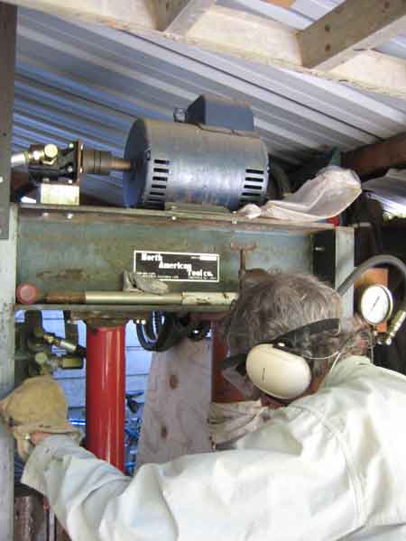 He began with a 30-ton press frame, added a custom-built ram, slider thingie, uh…’other stuff”…and a week or two later, a poignant hum (about an E flat)  emanating from the front yard means that the splitting has begun. The apparatus is seven feet high, and there have been no rounds too large to split (so far).