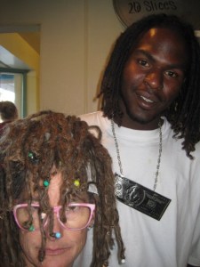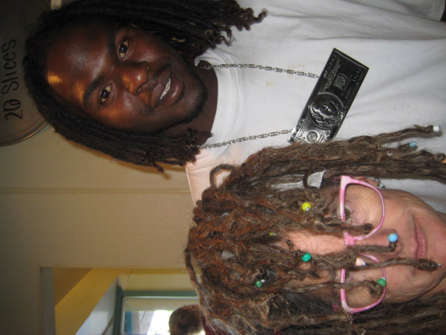 Money not only had fine, perfect black dreads the size of #4 yarn–he wore a solid metal version of a dollar bill around his neck on a poodle-worthy silver chain.  I got a picture of us both.