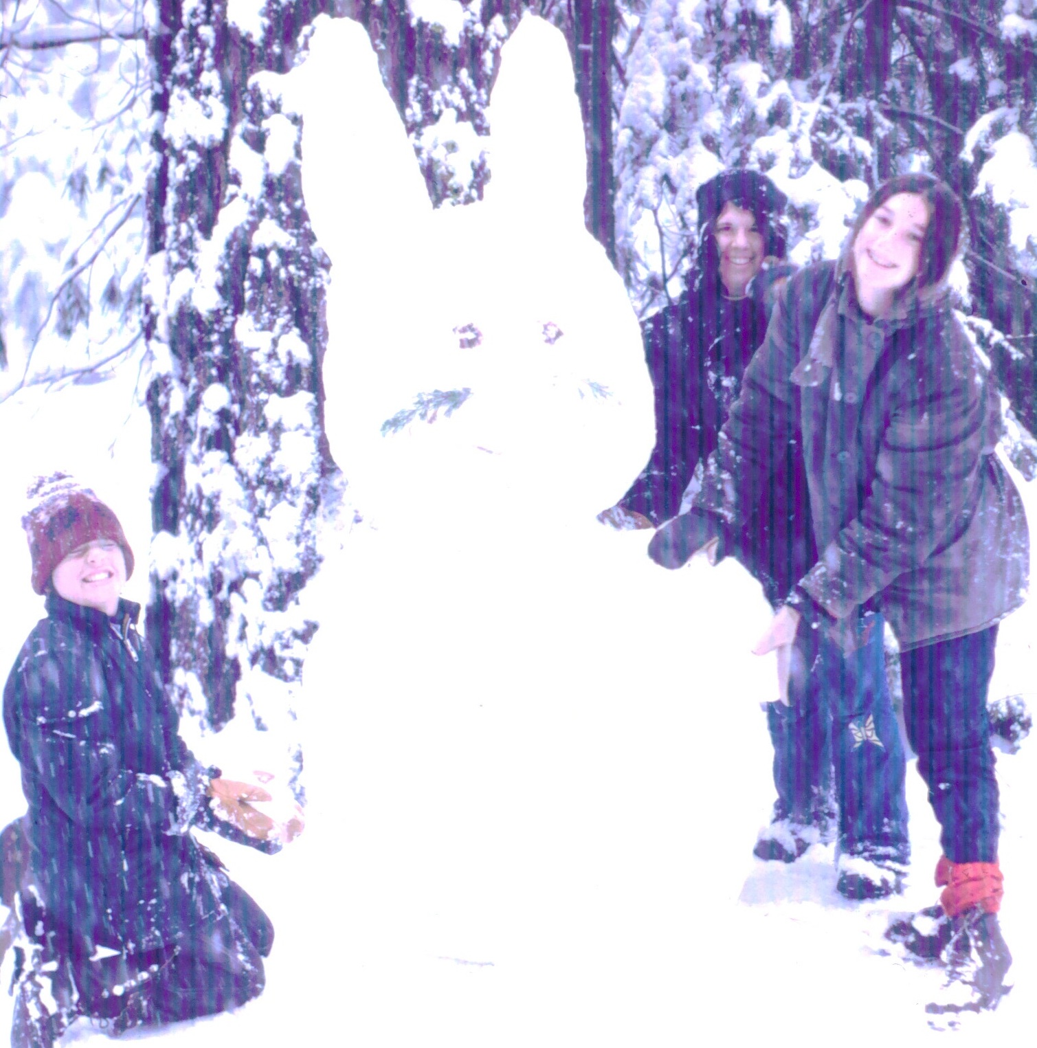 My sister and I created a similar snow-based beast, only ours was ostensibly a cat I was the unfortunate child in the red bobble cap and enormous nerd glasses.