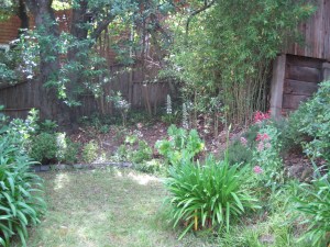 Right. So I raked, chopped, snipped, stepped back and was appalled. Resumed. Decided that the gardener is an artist, and she gets to decide that a neat, topiary-like rounded hedge is too formal for this excellent hillside abode with its gasp inducing view of Mount Tam. No, things need to look more natural here. Under all the azalea shrubs, a hundred baby live oaks sprouted this winter. I pulled them up ruthlessly.