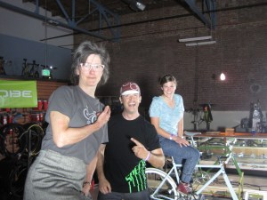 Ah the gold sprint– A fundraiser for MCBC: straddled a strange bike with tiny handlbar, get strapped in. Talked a shy-ish racer named Caitlin to try. We demo’d. Big fun, and my legs are toast. Rode home in a blissful sort of haze. Maybe I will spin madly for 20 seconds more often.