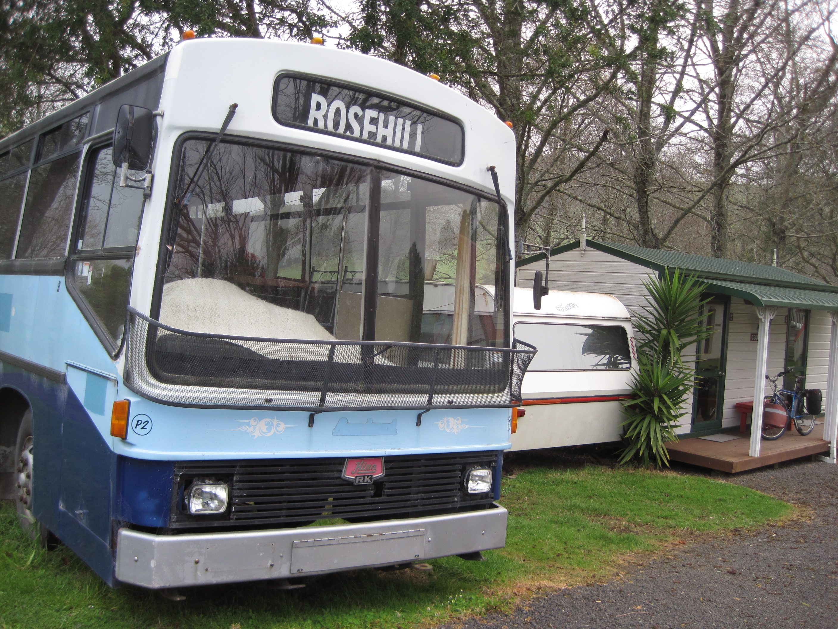 I’m staying in the deluxe “Rosehill” motor coach–a blue city bus from the 1960’s that looks like it was tornadoe’d off of the Black Rock Desert (see “Burning Man Festival”) earlier this month and plopped down in New Zealand, among a dozen tiny caravans and a handful of charming log cabinettes. When Gloria, the proprietress of Waihi Motor Camp said I could stay in it rather than the pequeno “Colonial” (room made of glass on two sides, filled with a bed and a little fridge-box), I leapt at the chance. No clue how to upload pix here, so imagine a blue and silver 30-foot bus flanked by puny caravans on a carpet of velvet green, in a manicured garden with streams, fields with sheep (some ofwhich I ‘dagged’–well, helped to dag. Watched being dagged. That’s when the strong young guy clips the poop-smeared wool from the sheeps butt. Then they were “drinched’ (given a squirt of vitt-amin), mani-pedicured, and got pink ear tabs. All while looking semi-comatose held up supine. I guess they go limp when on their backs?