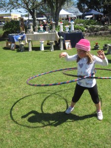 The market was twelve sellers of fine felted wool wearable art, kauri and macrocarpa wooden bowls and barrels, homemade jam (heaven! Feijoa jam! And Tamarillo jam, never heard of that), manukka honey and mosaic tiled garden art. Hardly anyone sold anything, but the hula booth was by far the most popular tent, with shy kids turning into hula demons while the occasional grandma gave it a go, and yes, several hoops found new homes. I demonstrated long enough to know I’ll have a waist-ache tomorrow.