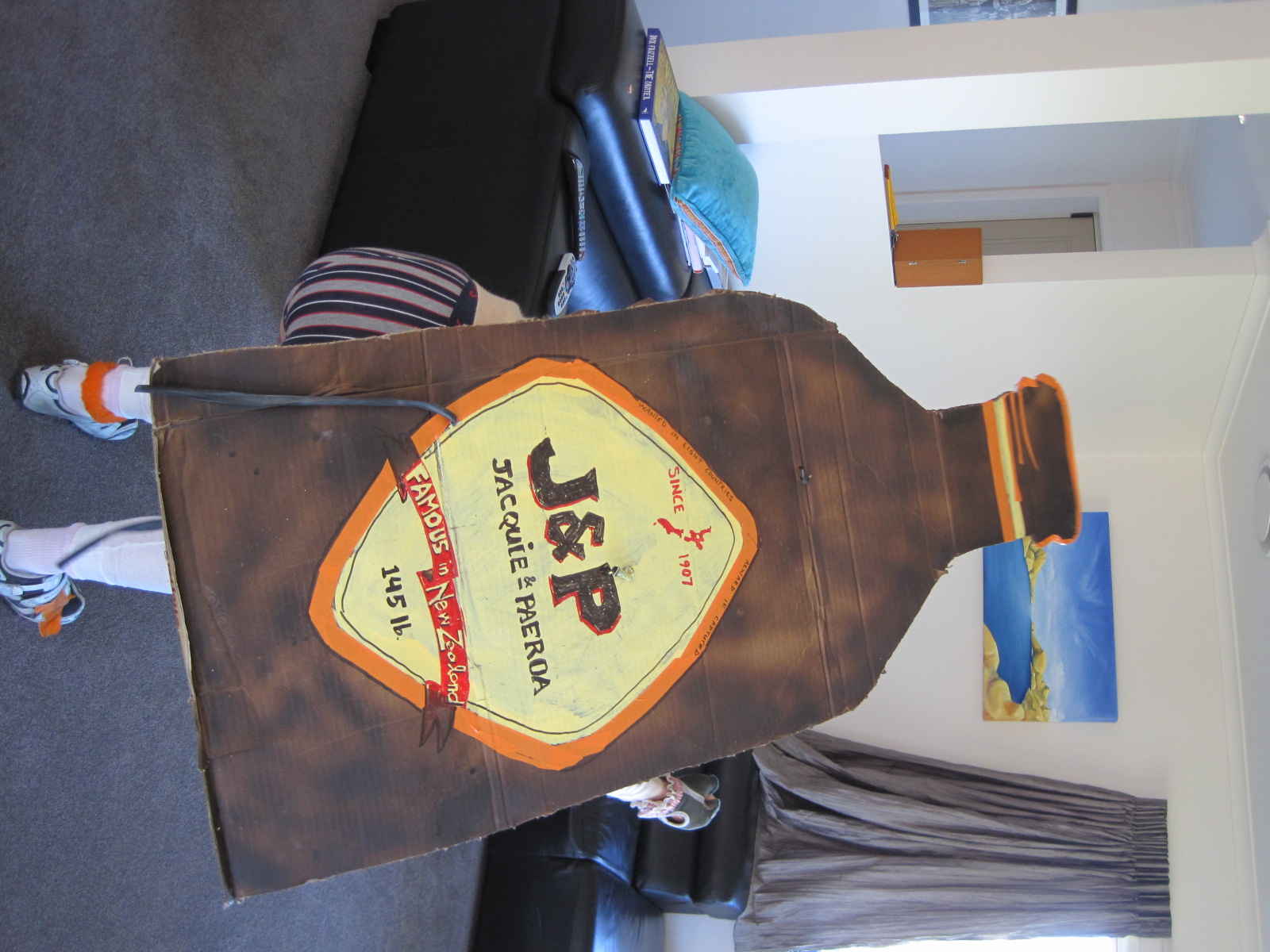 My costume has been developing nicely, and I know that a few hundred others have gleaned debris, or even just bought something at A J’s Warehouse or the Salvation Army…I’m sporting the iconic Kiwi soft drink, the L&P bottle , but with my initials. A bit wide for the twisty single tracks. That will oblige each overtaking rider to plead with me to pass.