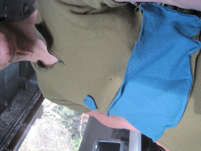 Then, in an attempt to feel better about the wardrobe malfunction, I carefully ripped out the seams (easy with Conrad OHO’s sew-sew stuff) and…pin back together again) this time with the seams on the inside. Slim down the middle section, and: got somewhere. Will put on next blog (feeble attempt at suspense).