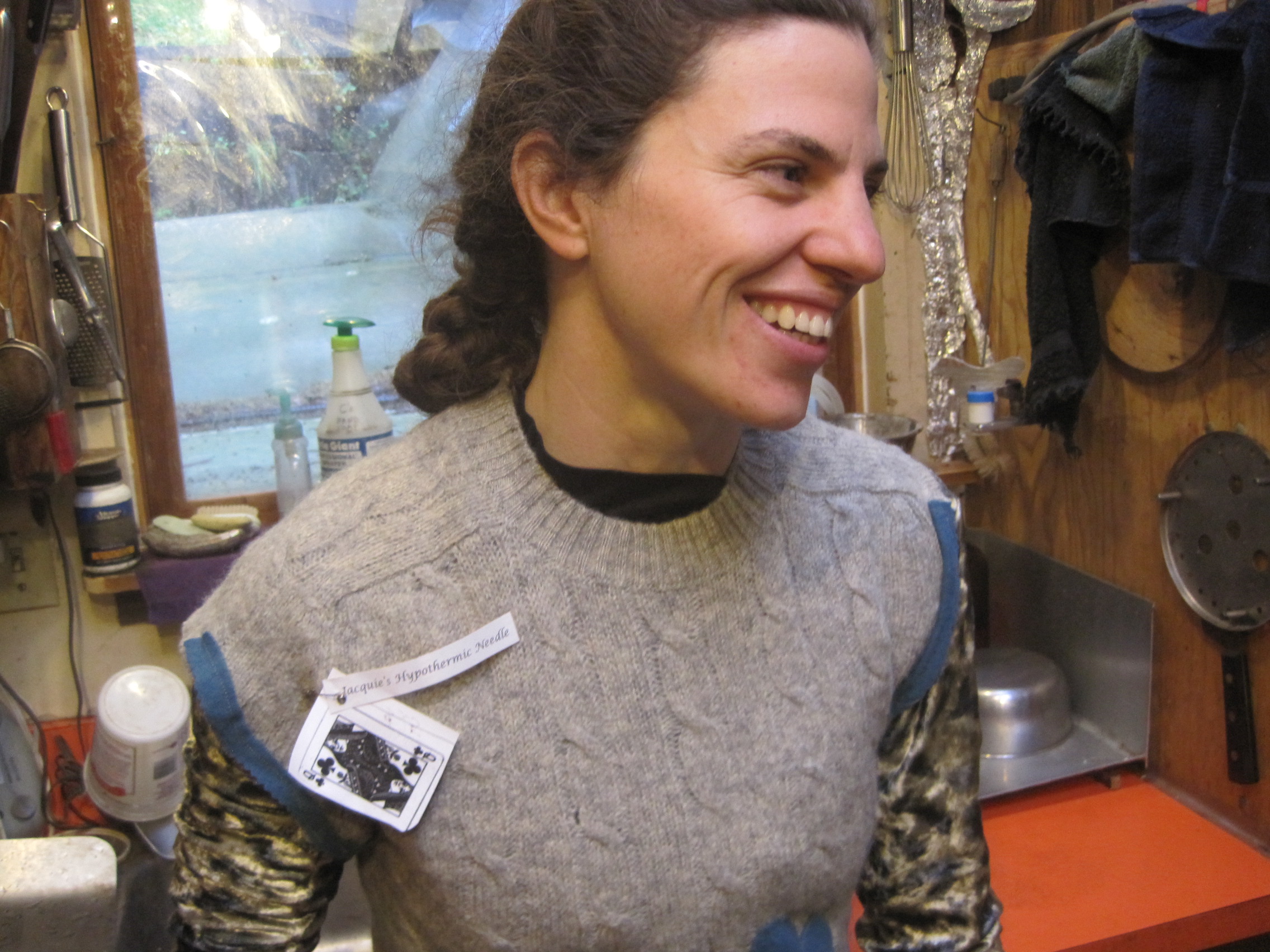 As it happened, I’d been mulling my old-woolens re-tooled idear: since it was down to 35 deg. Fahrenheit each night, I figured people might actually want to purchase my crashmere arm warmers, vests, etc. I created a ‘brand’ : “Jacquie’s Hypothermic Needle”, plus the Queen of Clubs.