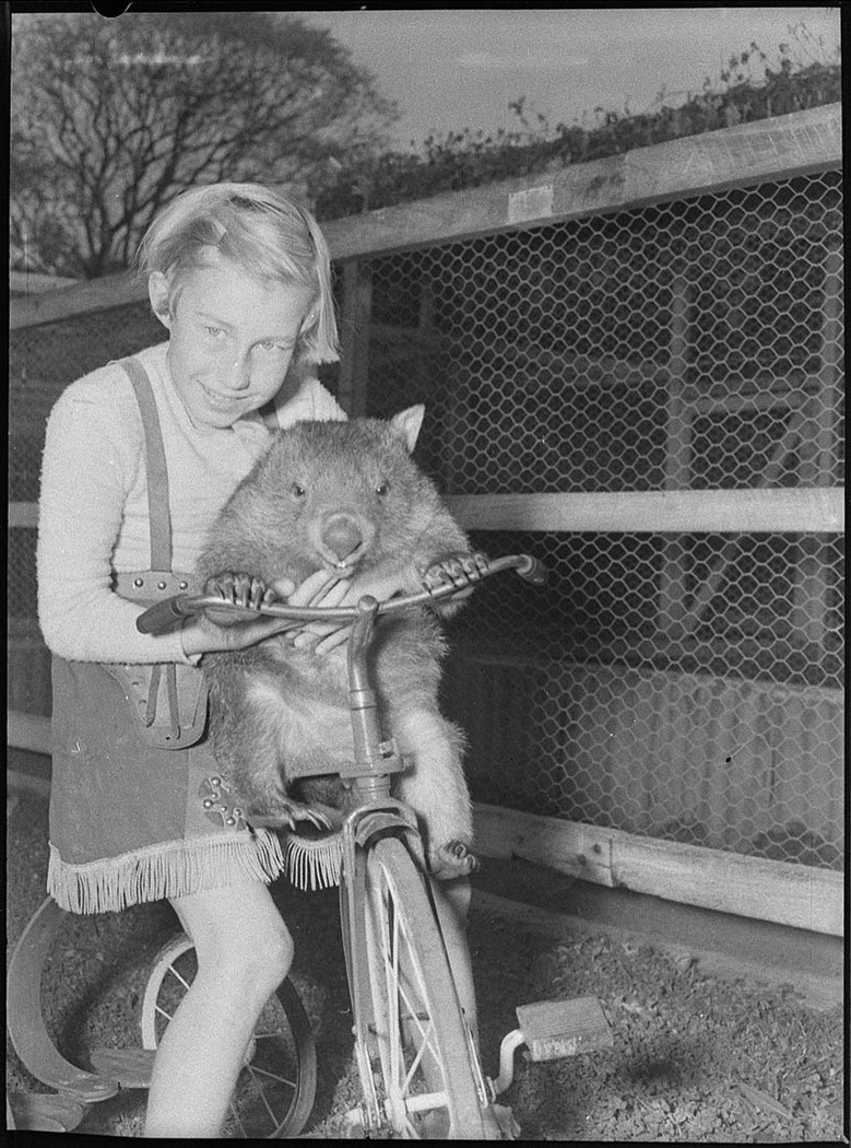 Gosh, what’s not to love about this picture? The little girl’s name is Petunia, which is splendid. The wombat (WOMBAT!) is fittingly getting a bike ride. And the wombat’s name is Josephine, which really is a terribly elegant name. Lucky girl(s).