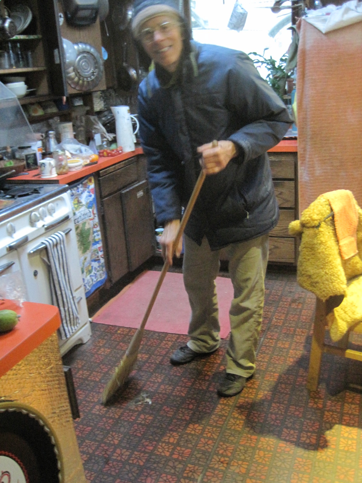 CC always turns on the radio in the house if the show is a good one, and this one had enough cantatas to drag His Shyness out from the treehouse into the quite warm thanks to the spaceship insulation hovel. Even after breakfast, Charlie lingered*, sweeping all the wood-chips and houseflith with the broom we brought home from Toad Hall. It’s a Quinn kitchenette, a seemingly hand-made job from Illinois. Chances are, Carol Cunningham used this same kind of broom as a child and re-discovered it recently (I’d never seen it at the Hall–it was pulled from a deep recess in kitchen pantry). There is a leather cuff where the corn straw joins the wooden handle, and since Charlie was marveling audibly about the absence of dustophilic static electricity, plastic bristle brooms all have it, I thought I’d google ’em.
