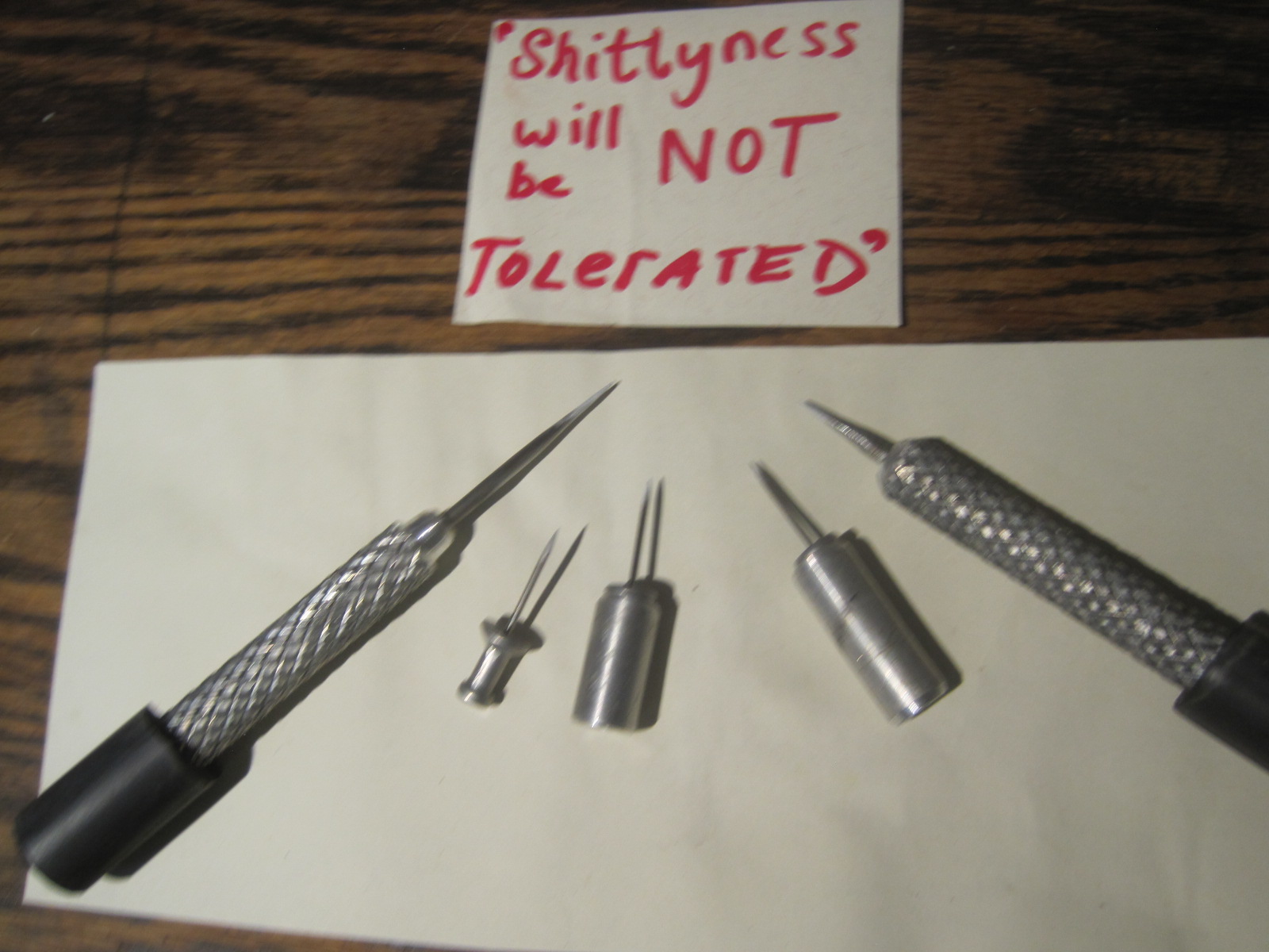 Into the shop, and a couple hours later, out came the kind of custom push-pin, made with sharpened music wire which apparently has lots of great properties, namely unlikely to bend and deform, and nicely knurled handle with a rubber grip. Several lengths… behold. Note the shop motto. Make that the Life Motto. IMG_7858