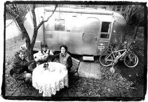 bikes laying against the door of the vintage trailer.