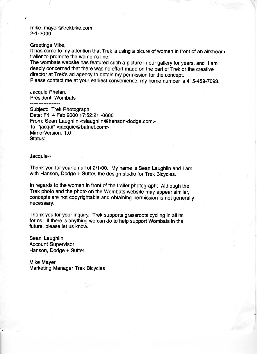 16. Jacquie, I feel for you and your plight. I was recently at the Bicycle Leadership Conference and oddly enough their was a panel discussion regarding “Global Identity: Protecting Your Brand In a Global Marketplace “. On the panel was Bob Burns from Trek who relayed a story about Nike selling a product called the “Trek”. Long story short …Nike replied to a request to the Trek cease request by say “Trek is a common work in the Websters Dictionary” to which Bob Burns replied back saying the new “Nike bike will be a nice addition to their line since Nike was a common word in Websters.” Let me recap for you what the lawyers in those big companies would tell you – Don’t waste your time, money or even any emotional energy on them.